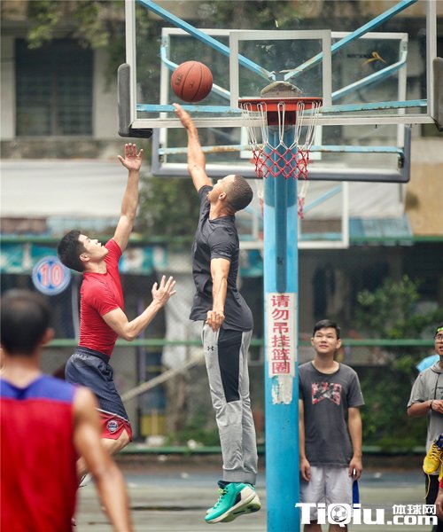 库里这次来到广州体育的露天篮球场与在校学生临时上演了一场友谊赛。