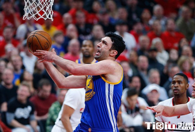 杜兰特高高跃起想要封盖开拓者队员的进攻。