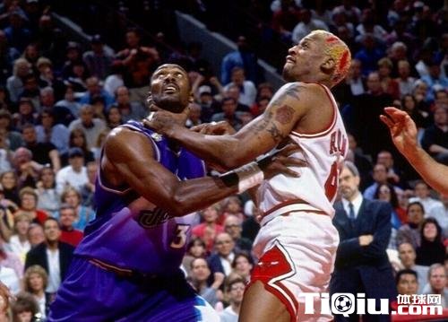 罗德曼天不怕地不怕,尤其是在抢篮板的时候动作非常大,最出名的大概就是他飞踹别人的动作了。