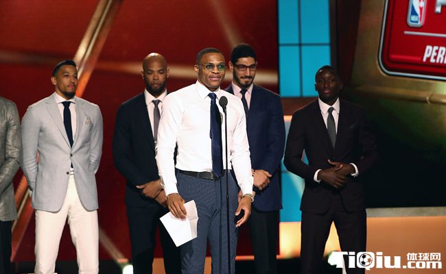 2016-17赛季NBA颁奖典礼,威少身后站着他雷霆的队友。