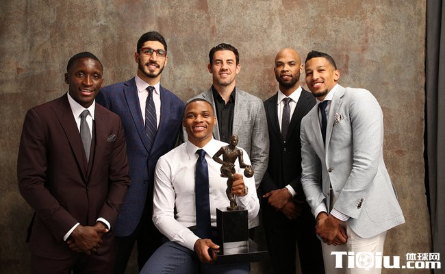 NBA颁奖典礼获奖者写真,威少手拿MVP奖杯和队友合影。