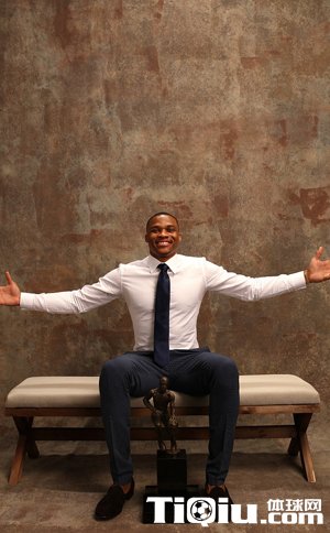 NBA颁奖典礼获奖者写真,威少与MVP奖杯合影。