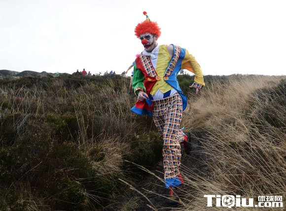 小丑装扮的跑者奔跑在佩尼斯通山国家公园的高沼地小路上。