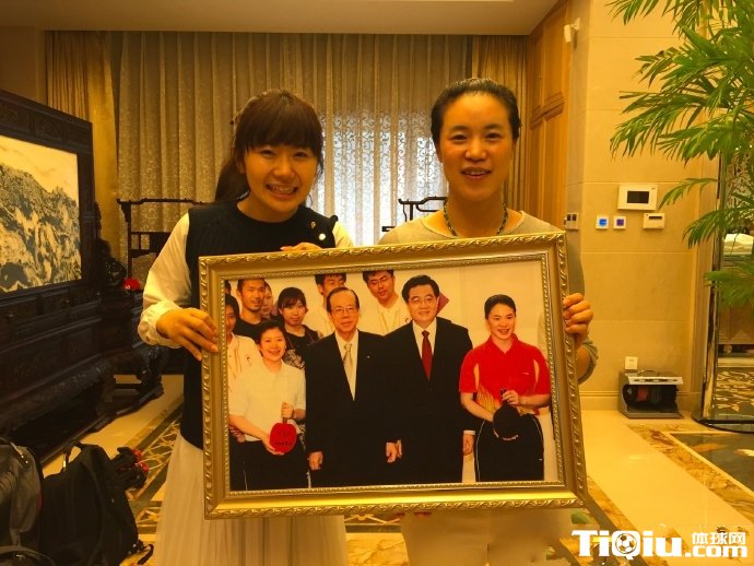 福原爱和王楠在豪宅内合影,手里拿着自己和前国家领导人的合照。