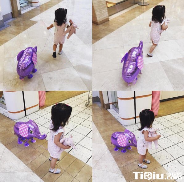 孙悦走在路上,左手拿着女儿心爱的玩具大象。