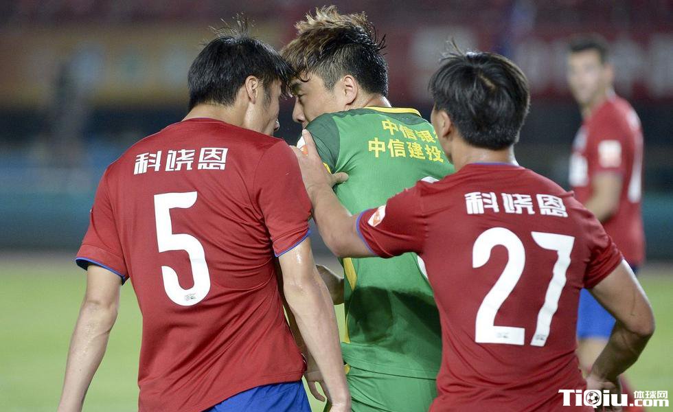 裁判出示第一张黄牌后,国安球员不满裁判判罚,与其进行商讨。