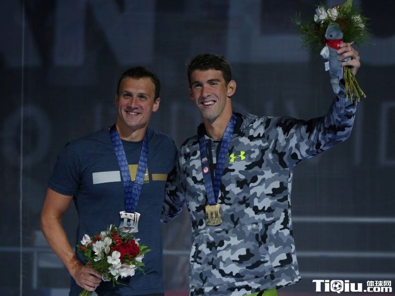 菲尔普斯获得美国游泳选拔赛200混冠军,罗切特获得亚军,两人领奖。