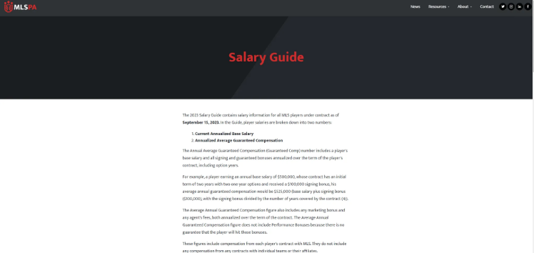2023工资数据表包含截至2023年9月15日所有MLS合同球员的工资信息。在单据中,球员的工资分为两个数字: