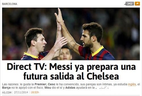 【导读】北京时间2014年11月28日消息,连续两场比赛上演帽子戏法,连续两场比赛,梅西让西甲和欧冠的历史进球纪录通通被改写。在巴塞罗那已经几乎收获所有团队和个人荣誉、“无欲无求”的阿根廷天才或许会在不久的未来选择去英超进行新的冒险,而近期有关梅西和巴塞罗那高层交恶的传闻更是闹得沸沸扬扬。而根据阿根廷Direct TV电视台的报道,梅西未来的最大去向便是本赛季被穆里尼奥改造为华丽不败之师的切尔西。