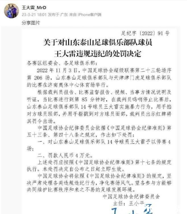 对于这个问题,很多人当然内心复杂,特别是山东泰山王大雷就被足协处罚,也是王小平签的字,这个处罚单还被王大雷发在社交平台上,现在还能找到,说明当时他十分痛恨王小平,也想为此做一个纪念,如今看到仇人进去,能不开心吗?