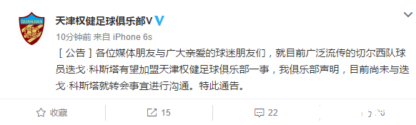 [公告]各位媒体朋友与广大亲爱的球迷朋友们,就目前广泛流传的切尔西队球员迭戈·科斯塔有望加盟天津权健足球俱乐部一事,我俱乐部声明,目前尚未与迭戈·科斯塔就转会事宜进行沟通。特此通告。