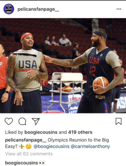 今天早些时候,一位网友在Instagram发了张考辛斯跟安东尼在国家队训练的合照。而另一位网友则在推特上写道,“如果甜瓜去了鹈鹕跟考辛斯和戴维斯做队友,天哪。”