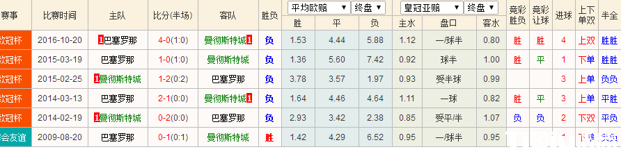 两支球队近四年欧冠中3次交手,在2014/15赛季的欧冠八分之一决赛中,巴萨客场2-1、主场1-0双杀曼城,那一年巴萨在决赛中以3:1战胜尤文图斯夺冠。2013/14赛季,巴萨也是在八分之一决赛遇到了曼城,两回合以客场2-1和主场2-0战胜曼城,不过在四分之一决赛中被马竞2-1淘汰。本赛季,两队在小组赛中狭路相逢,之前,巴萨主场4-0大胜曼城,这让瓜迪奥拉的重返诺坎普之旅十分难堪。如此一来,双方此前5次正式交锋,巴萨取得全胜战绩,心理优势明显。