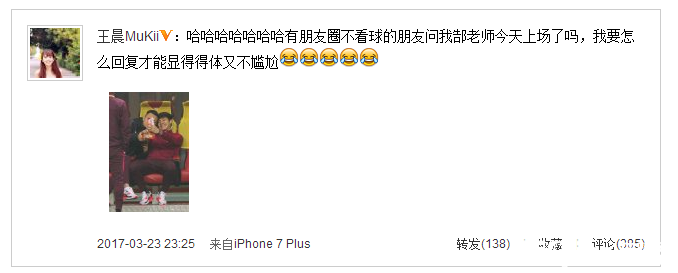 世预赛第6轮,凭借着首发中锋于大宝的头球破门,国足在长沙1-0战胜韩国队,中国队取得了12强赛的首场胜利。赛后全国上下无不沉浸在欢乐的气氛中。而一向擅长搞怪的郜林爱妻王晨也是在微博调侃郜林。