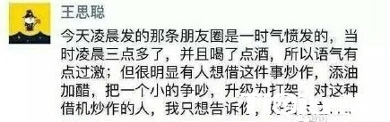 除此之外,网上还出现了疑似王思聪在朋友圈发言的截图,文中写道“以后我看见吴迪一次打一次,不弄死她老子不姓王……”,后来又表示自己因为喝酒导致语气激动,指责事件被添油加醋,把一个小的争吵,升级为打架。