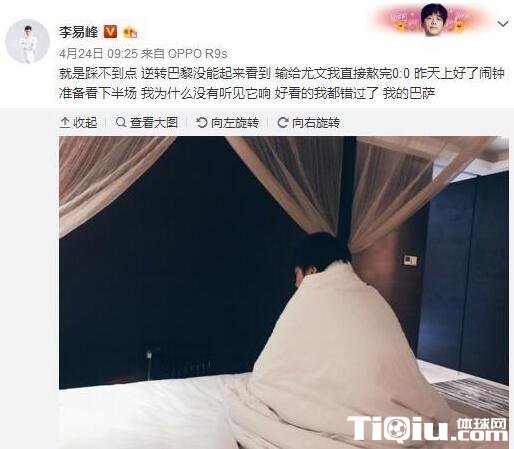 李易峰微博截图 李易峰自曝起太晚错过国家德比