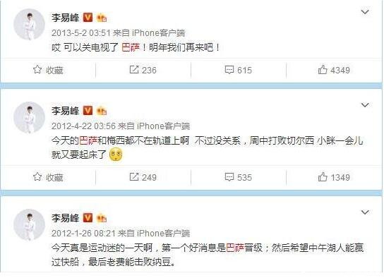 从李易峰过往微博记载来看,巴萨无疑是他的主队之一,早在2012年他就已经在微博上公开表明自己对巴萨的喜爱,且在2010年的一条微博里我们已经能感受到他对足球运动的热爱。