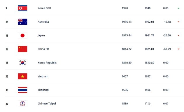在东京奥运会的惨淡战绩让中国女足的积分比上一期公布时少了60.79分,最新积分为1814.22分;总排名则下滑两位,最新排名列第17位,在亚足联榜单上则仍列朝鲜队、澳大利亚队和日本队之后排名第四,不过身后的韩国女足仅落后中国女足3.33分。