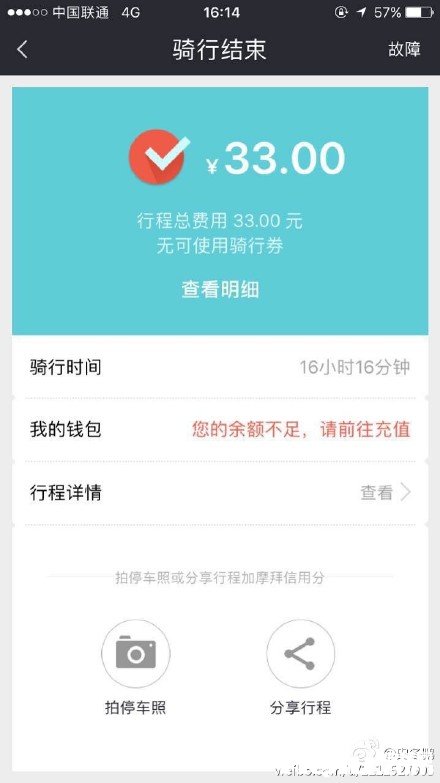 在骑行了16小时16分钟之后,骑行记录显示史冬鹏需要支付33元的租车费用,下面还提示“您的余额不足,请前往充值。”